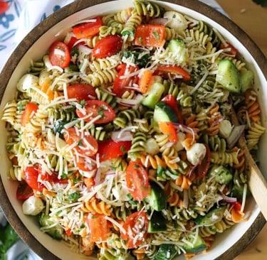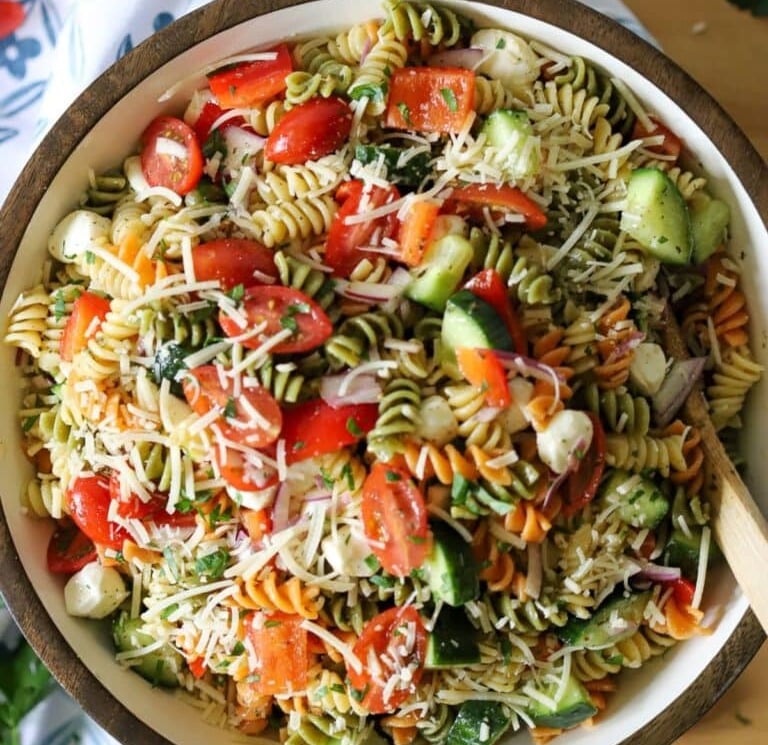In a bowl, combine pasta, tomatoes, cucumber, olives, and feta.